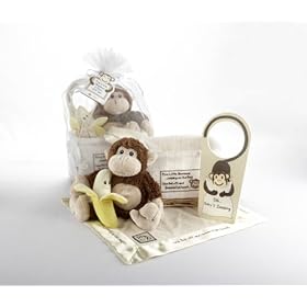 Share the cherished memories of your childhood with the beautiful newborn in your life! Bring baby the joy of a timeless nursery rhyme with the "Five Little Monkeys? Gift Set, delightfully filled with a bunch of adorable baby-sized toys! This charming gift includes: ? A precious, bright-yellow, sweet-faced banana rattle ? A plush brown-and-tan monkey ? A satin-trimmed, cream-colored "lovie? blanket with a monkey-face appliqué and part of the rhyme embroidered on the satin trim ? A door hanger, adorned with a long-tailed monkey hugging a pillow to let company know that "baby?s sleeping? ? A natural-wood, keepsake basket lined with textured, white fabric featuring part of the rhyme and a smiling monkey on the front ? Gift set measures 10½? h x 7? w x 5 ½? d ? Beautifully presented in a sheer, white organza bag with a satin drawstring