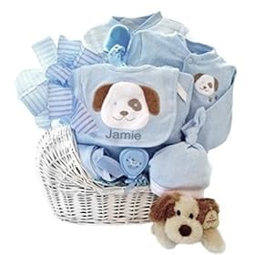 The new baby boy has arrived! Send this adorable baby bassinet filled with wonderful gifts to welcome the new arrival. A sweet puppy cardigan and matching layette are perfect for a new baby boy. This coordinating super soft puppy is just what baby needs to cuddle. (Sorry personalization of this gift is not available through our Amazon storefront.)